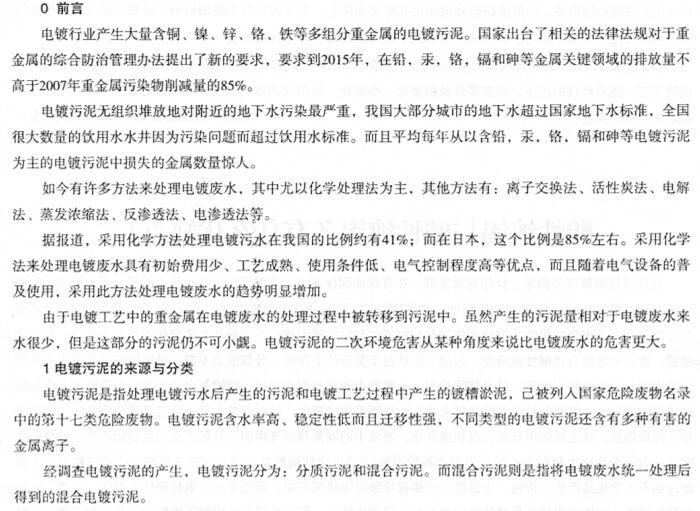 摘要——电镀污泥含有一定量的铜、镍、铬、锌等金属,属于危险废物。对其中的金属(尤其是重金属)进行资源化利用,能有效地消除电镀污泥重金属的二次污染,同时也能带来可观的经济和环境效益。本文介绍了电镀污泥的来源与分类,重点介绍了电镀污泥的国内外处理方法,为今后的研究提供一些思路,最大限度的减少重金属污染。